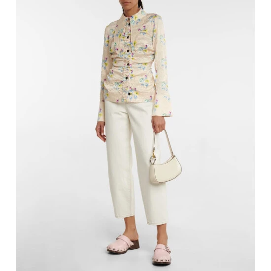 These clogs from Ganni are made from smooth pink leather that’s attached via oversized rivets to the wooden soles. They feature decorative buckled straps.