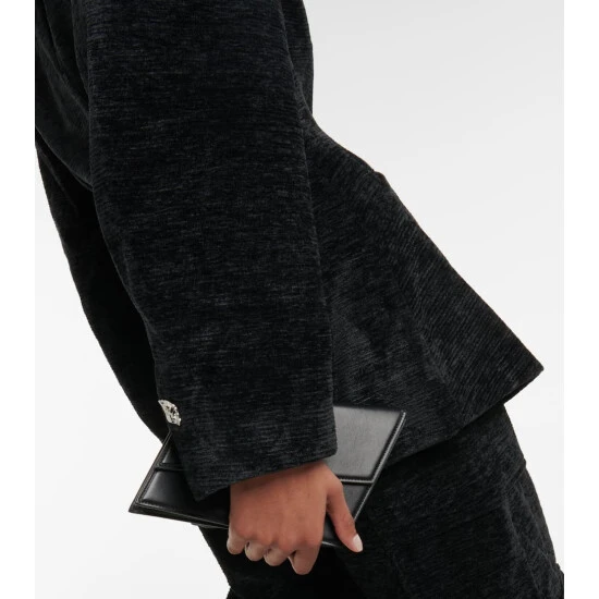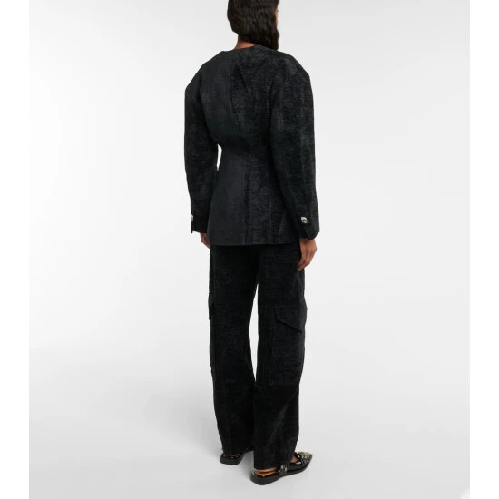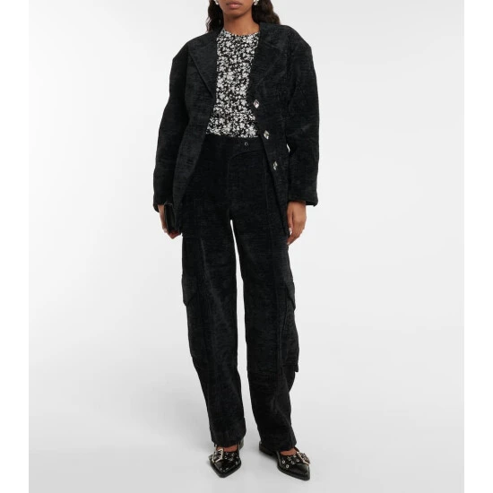 For a statement-making look, consider this blazer from Ganni. Made from cotton-blend chenille, it features a sculptural silhouette with strong shoulders and a V-neckline, and it’s finished with brand-signature diamond-shaped buttons.