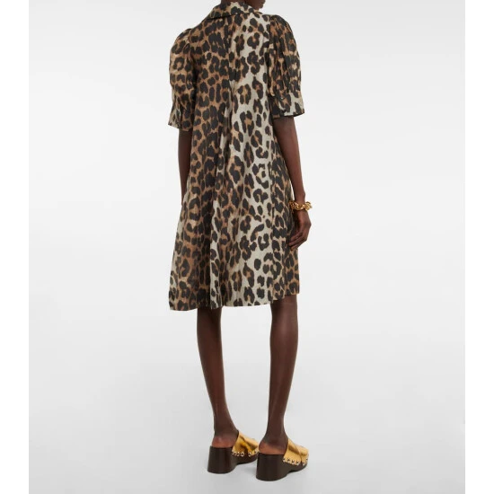 This midi dress from Ganni is made from a breathable, semi-sheer material with a magnified leopard print. It has short puff sleeves, a shirt collar, and on-seam side pockets.