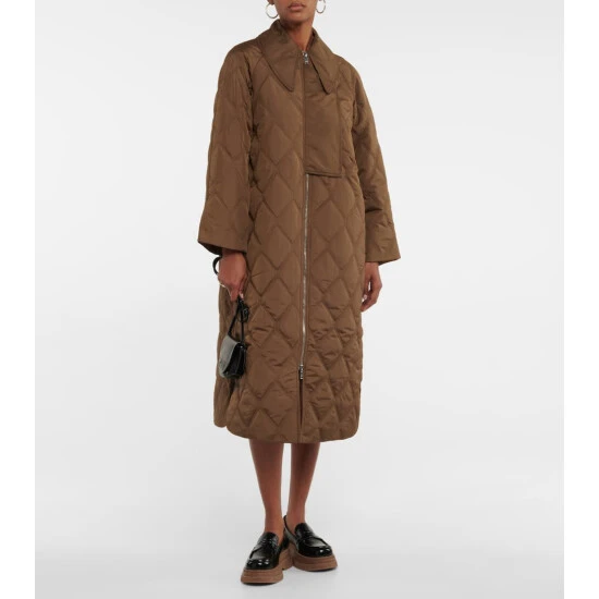 Ganni explores vintage design with this brown quilted coat, featuring a large collar. The piece has an oversized silhouette with dropped shoulders and a wide fit.