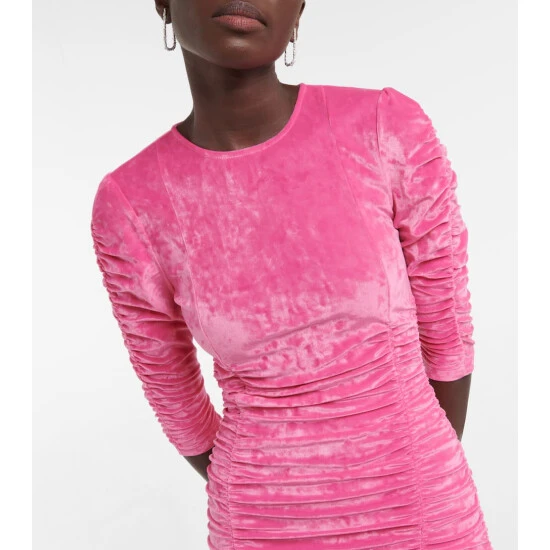 Copenhagen-based brand Ganni reshapes the meaning of Scandinavian style with its whimsy and playful approach to design. In a spirited pink color, this minidress is made from velvet and ruched along the front, side and back seams.