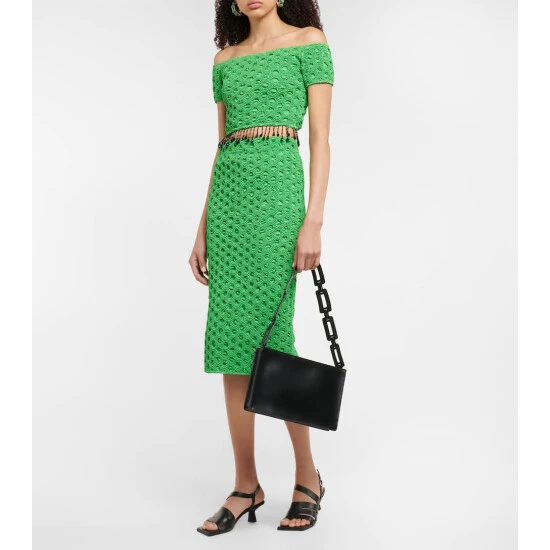 This top from Ganni is made with a lustrous satin finish that transitions from desk to dinner aesthetic with ease. It features beaded fringes, an off-shoulder neckline, and smocked bodice.