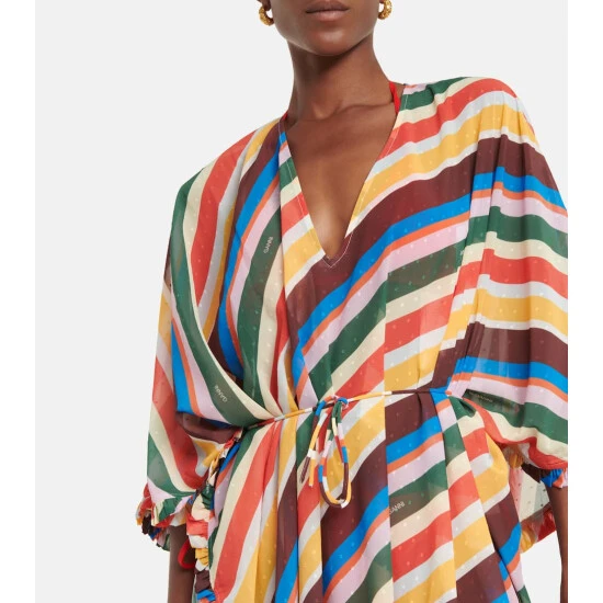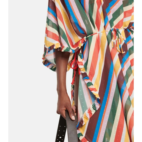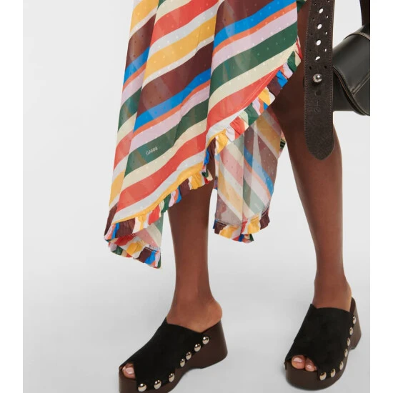 Stand out in style with this maxi dress from Ganni. Finished with ruffle trims and a self-tie waist belt, it’s made from semi-sheer, vibrantly striped, dotted chiffon fabric – the perfect breezy silhouette.